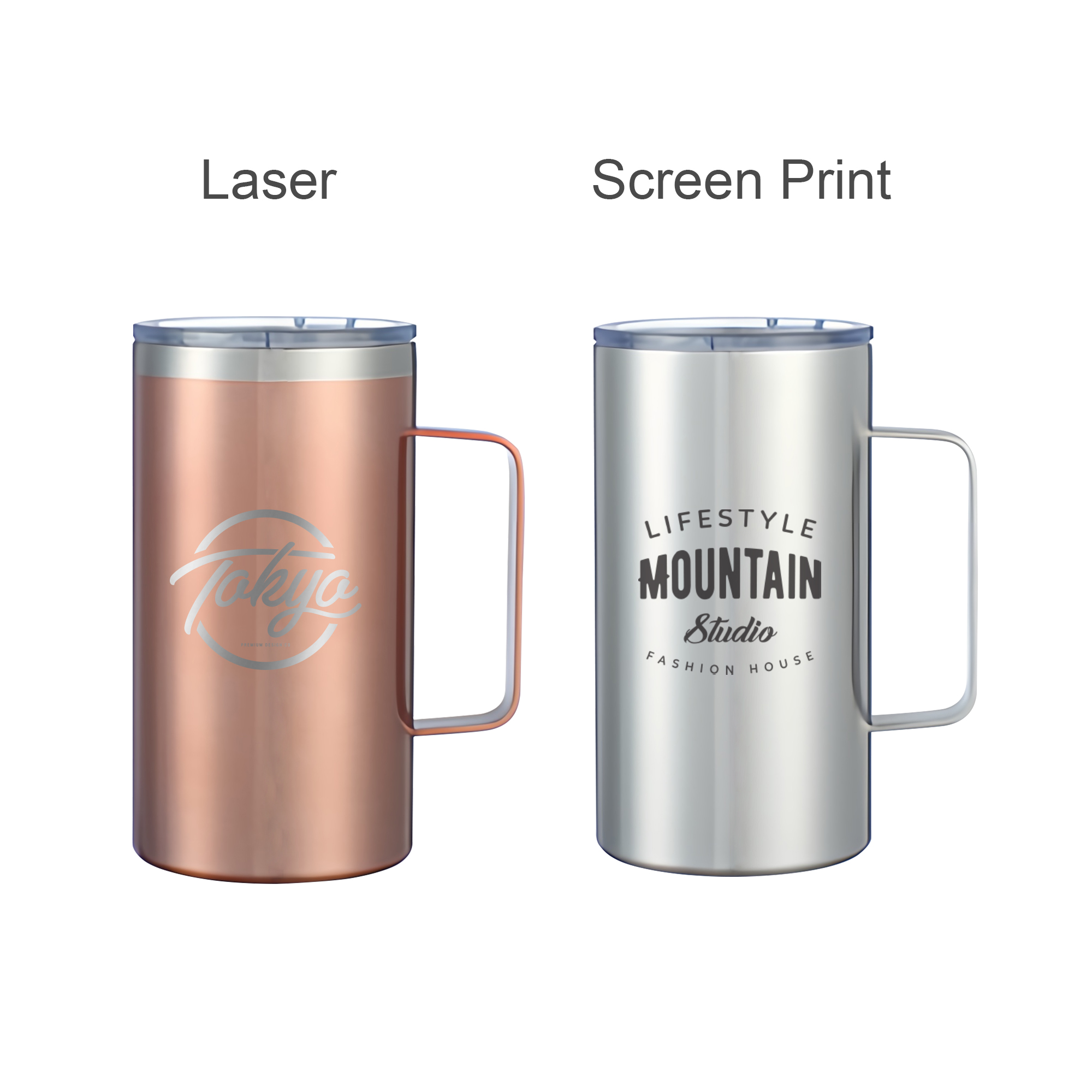 Enjoy your favourite hot or cold drinks in our generous 625ml stainless steel mug featuring a comfortable handle for easy carrying. Crafted from premium 304 stainless steel with its double-wall vacuum insulation. The lid helps to provent spills while the large capacity reduces refill needs. Personalise it with crisp screen printing or elegant engraving to showcase your brand with sophistication. Ideal for office use, outdoor activities, or corporate gifting, this mug combines practical functionality with professional style for daily hydration needs. Sizing: Capacity: 625ml Size: Dia(including handle) 12cm x16cm Weight: 384g/pc. Materials: Inner: 304 stainless steel/Outer: 304 stainless steel. Price Notes: Price is ex-GST. Please note that this product is not dishwasher safe and handwashing is recommended. Please contact us for more printing options. Print Position: Body.4week